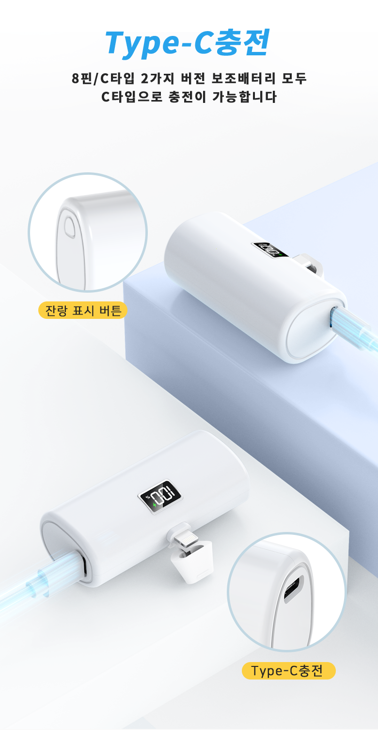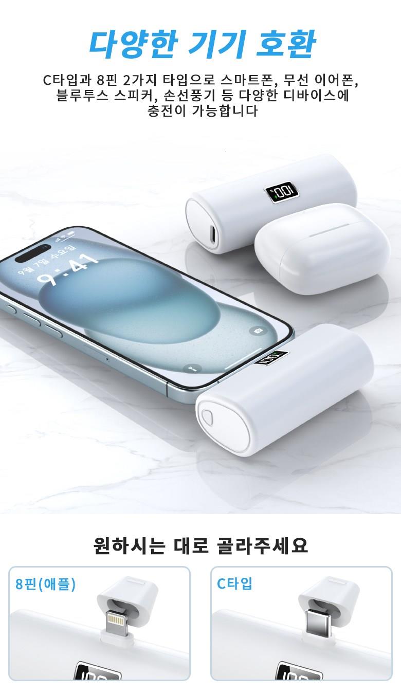 C타입과 8핀 2가지 타입으로 스마트폰, 무선 이어폰, 블루투스 스피커, 손선풍기 등 다양한 디바이스에 충전이 가능해요.