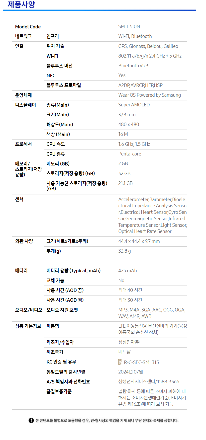 | 품명 및 모델명 | 삼성전자 갤럭시워치 7 / SM-L310N |