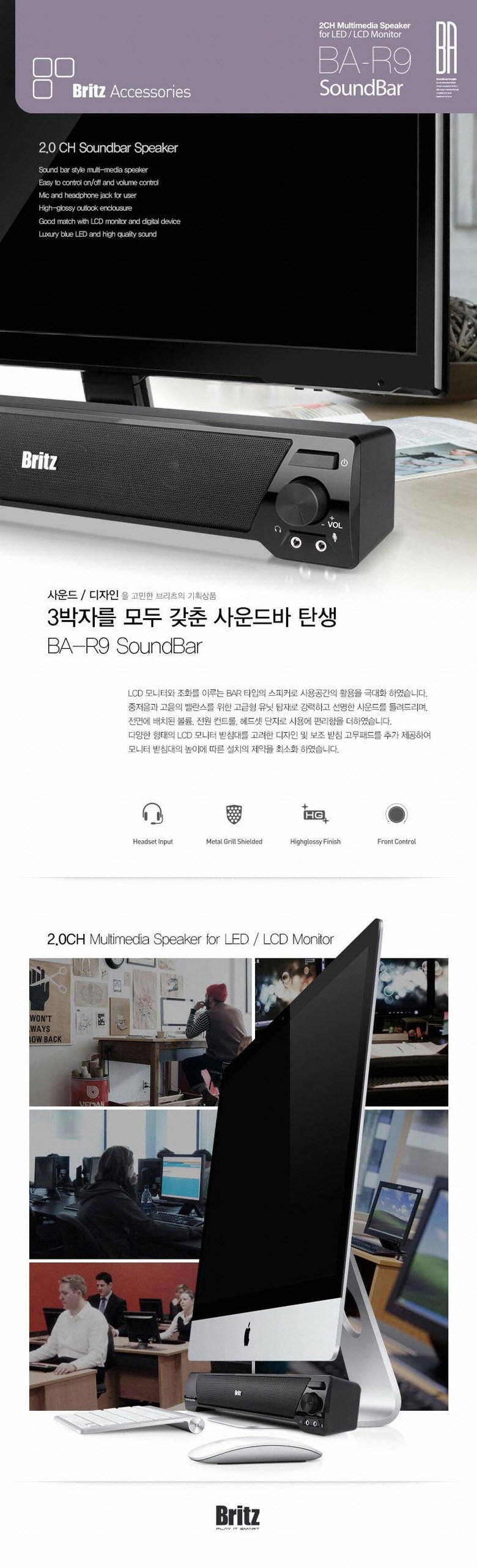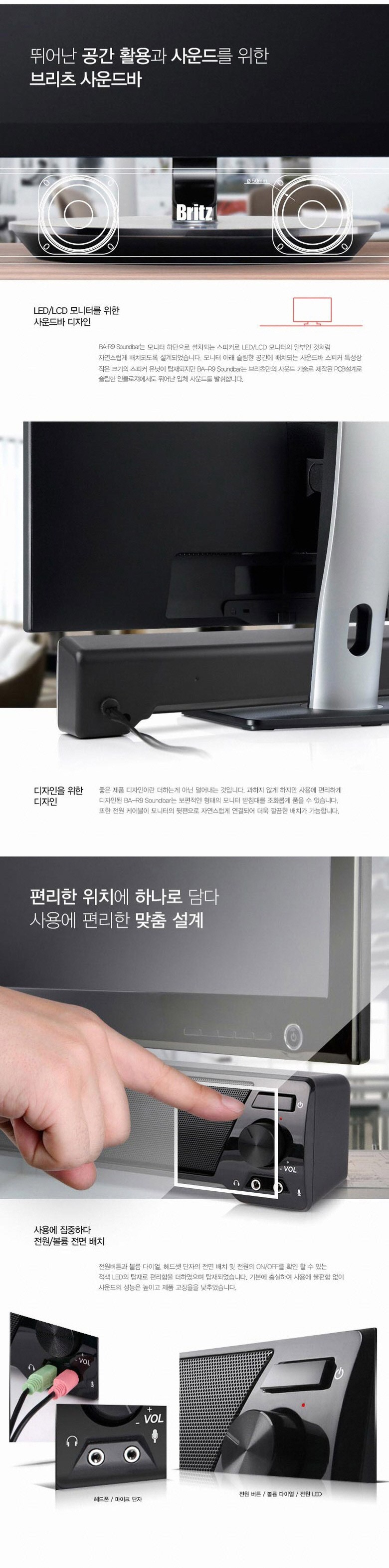 ✔. 사운드, 디자인 을 고민한 브리츠 기획상품, 3박자를 모두 갗춘 사운드바 => LCD 모니터와 조화를 이루는 BAR