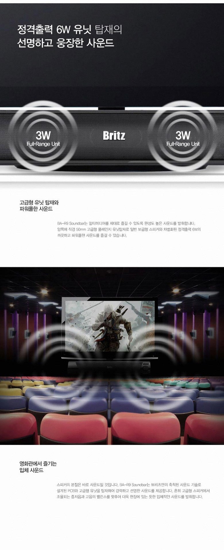 ✔.정격출력 6w 유닛 탑재의 선명하고 웅장한 사운드 =>BA-R9 Soundbar는 멀티미디어를 제대로 즐길 수 있도록